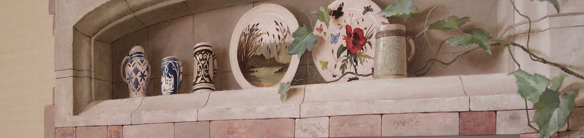 Далее уже на месте я строю рисунок и перспективу росписи обманки меняя масштаб и детали на свое усмотрение. Какие бы не были точные эскизы для росписи стен всегда, что-то приходиться изменять на месте в рисунке, перспективе, цвете. Заполнение и прорисовка деталей на эскизе не покажешь, она оговаривается заранее и качество этой прорисовки зависит полностью от художника.